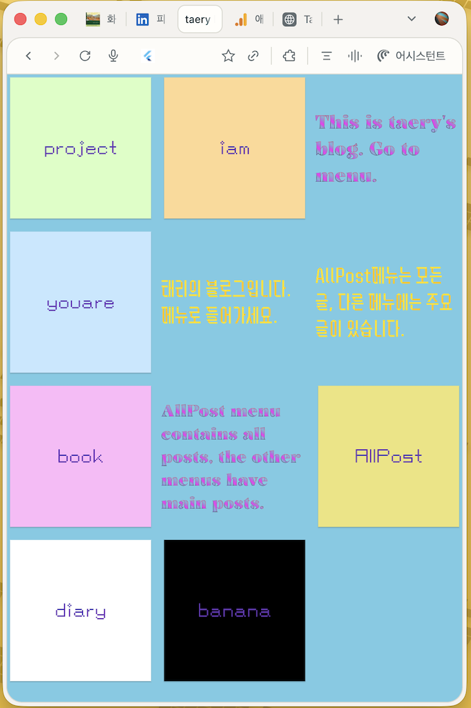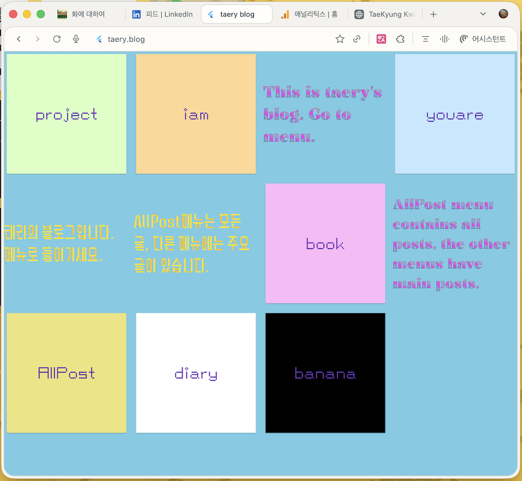 Velog -> Github Blog -> GitBook을 거쳐 자유도를 위해 블로그를 자체 개발했다. 현재 대략 기능을 하는 블로그가 완성되었다. 느낀점은, 생각보다 만들기 어렵다는 것이다. 예상치 못한 예외처리를 해야한다. 데모 느낌의 개발과 실 서비스의 괴리가 크다는 것을 알게 되었다.